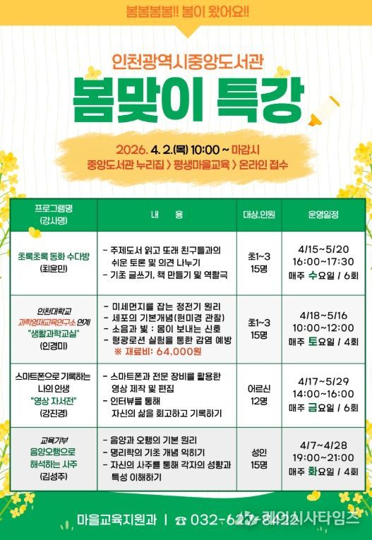 (케이시사타임즈) 인천광역시교육청중앙도서관은 4월부터 지역주민의 배움과 여가를 지원하기 위하여, 다양한 연령층을 대상으로 ‘봄맞이 특강’을 운영한다.