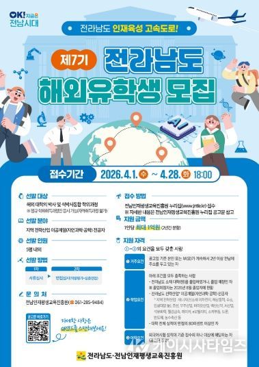 (케이시사타임즈) 전라남도와 전남인재평생교육진흥원은 글로벌 핵심 인재 육성을 위해 세계 명문대 유학 기회를 제공하는 ‘제7기 전라남도 해외유학생’을 오는 28일까지 모집한다고 밝혔다.