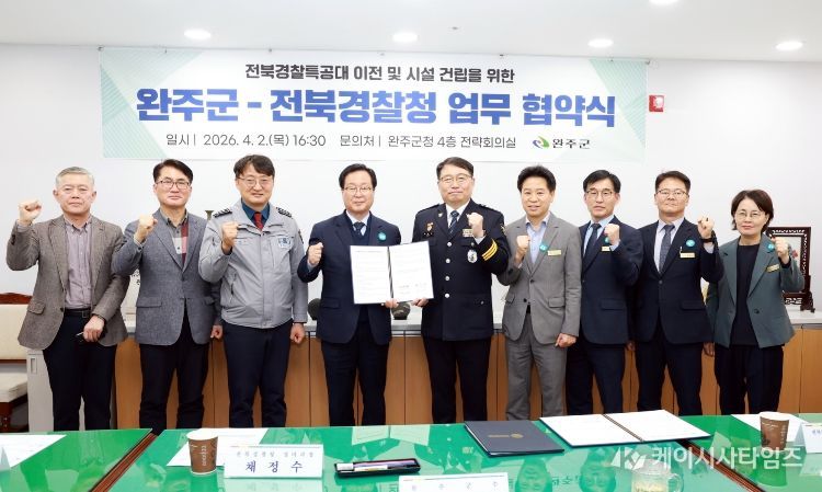 (케이시사타임즈) 완주군과 전북경찰청은 2일 완주군청 전략회의실에서 경찰특공대 이전 및 청사 신축을 위한 업무협약(MOU)을 체결하고 전북 경찰특공대 이전 사업을 본격적으로 추진하기로 했다.