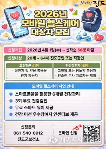(케이시사타임즈) 진도군보건소는 4월 1일부터 ‘2026년 모바일 헬스케어 2기’ 대상자 56명을 선착순으로 모집하고 있다.