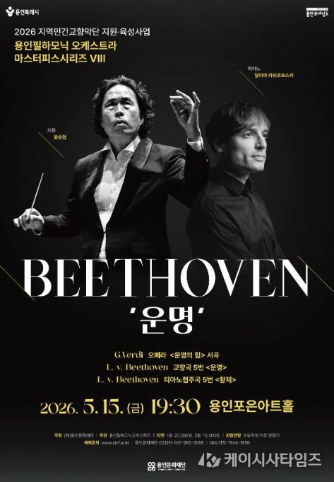 (케이시사타임즈) 용인문화재단은 오는 5월 15일 오후 7시 30분 용인포은아트홀에서 ‘2026년 지역민간교향악단 지원·육성사업’의 첫 공연으로 용인필하모닉오케스트라의 기획공연 '마스터피스 시리즈 Ⅷ - 베토벤 ‘운명’'을 선보인다.