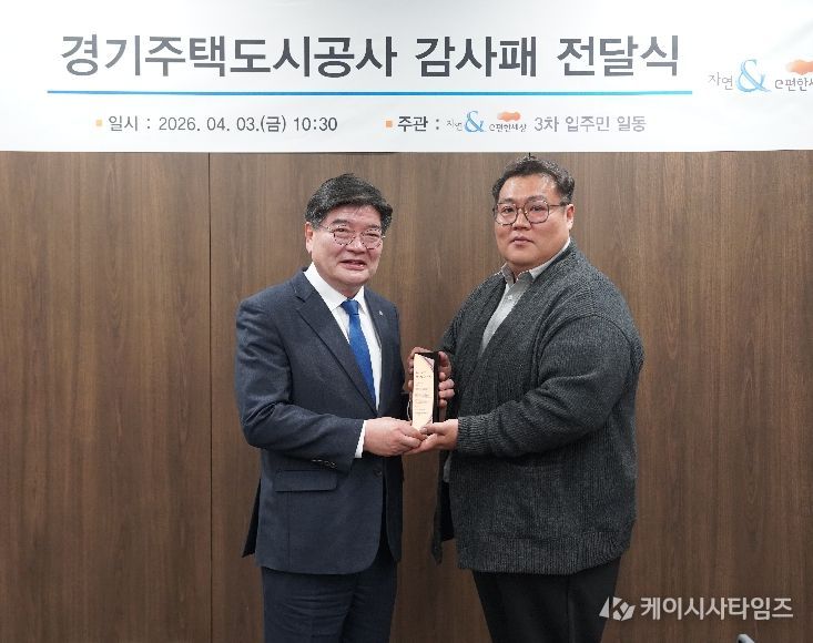 (케이시사타임즈) 경기주택도시공사(GH)가 수원 본사에서 다산자연앤이편한세상3차 아파트 입주민들로부터 원활한 조기 분양전환 노력과 제도적 지원에 따른 공로를 인정받아 감사패를 받았다고 3일 밝혔다.