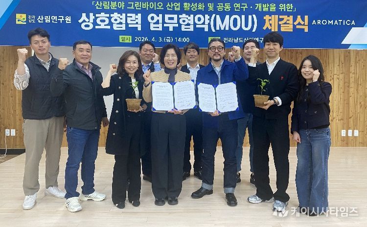 (케이시사타임즈) 전라남도산림연구원은 3일 ㈜아로마티카와 업무협약을 하고, 전남의 비교우위 난대 산림자원에서 추출한 에센셜오일을 활용해 케이(K)-뷰티 화장품 개발과 산업화를 본격 추진한다고 밝혔다.