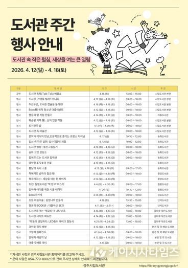 경주시립도서관 관계자는 “도서관 주간을 맞아 시민들이 책과 도서관을 더욱 가깝게 느낄 수 있도록 다양한 프로그램을 준비했다”며 “가족과 함께 도서관을 찾는 즐거운 시간이 되길 바란다”고 말했다.