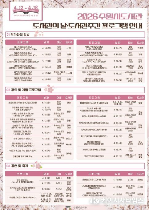 (케이시사타임즈) 수원시도서관이 제62회 도서관주간(4월 12~18일)을 맞아 ‘도서관 속 작은 펼침, 세상을 여는 큰 열림’을 주제로 다양한 독서문화 프로그램을 운영한다.