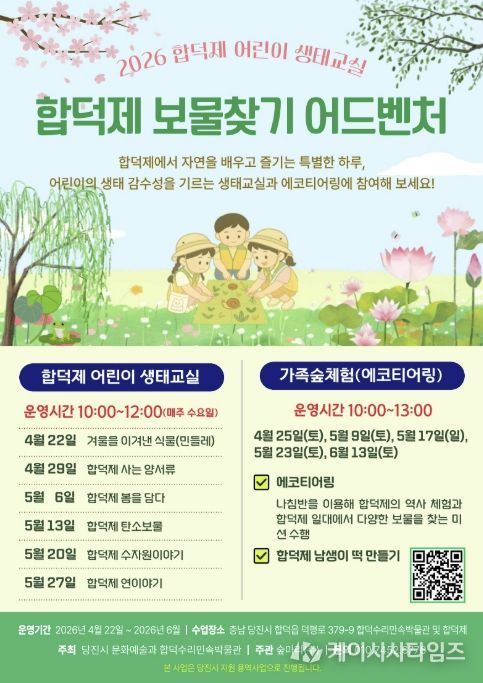 (케이시사타임즈) 당진시는 오는 6월까지 합덕제 야외 현장 및 합덕수리민속박물관에서 2026합덕제 어린이 생태교실 및 보물찾기 어드벤처 프로그램을 운영한다고 7일 밝혔다.