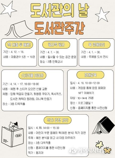 노경희 도서관장은 “도서관의 날과 도서관주간을 맞아 주민들이 책과 문화를 더욱 풍성하게 경험할 수 있도록 다양한 프로그램을 준비했다”라며 “대출 확대부터 체험, 전시, 교육, 강연까지 폭넓게 마련된 행사에 많은 관심과 참여를 부탁드린다”라고 전했다.