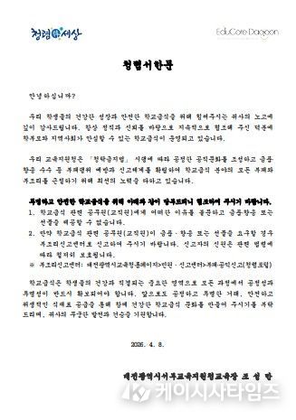 대전 소재 식재료 공급업체를 대상으로 발송한 교육장 청렴 서한문에는 학교급식 관련 공직자에게 금품이나 향응 또는 선물 등을 제공할 수 없음을 명시했다. 또한 관련 공직자가 이를 요구할 경우 대전시교육청 누리집 내 부조리 신고센터로 신고할 수 있도록 안내했다.