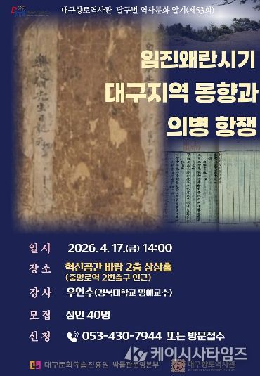 (케이시사타임즈) 대구문화예술진흥원 박물관운영본부 소속 대구향토역사관은 2026년 대구시민주간 연계 프로그램으로 ‘임진왜란시기 대구지역 동향과 의병 항쟁’을 주제로 4월 17일 2시에 전문가 특강을 개최한다.