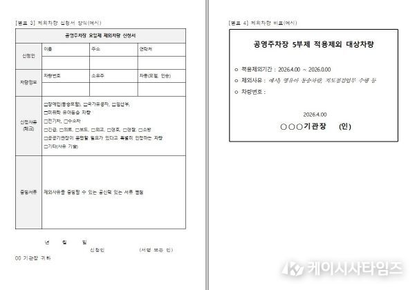 아울러 공단은 장애인·임산부 차량, 특수목적 차량, 전기차·수소차 등 불가피한 사유가 있는 경우를 고려하여 ‘공영주차장 요일제 제외차량 신청서’를 통해 제외차량을 운영할 계획이다. 해당 차량은 각 주차장 관리사무소에 방문하여 신청서를 작성하면, 내용 확인 후 ‘제외차량 비표’를 발급받아 이용할 수 있다.