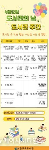 (케이시사타임즈) 보은교육도서관은 오는 4월 12일부터 18일까지 ‘도서관의 날·도서관주간’을 맞아 지역 주민의 독서문화 확산을 위한 다양한 프로그램을 운영한다고 밝혔다.