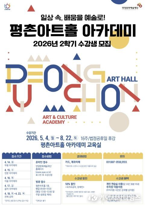 (케이시사타임즈) 안양문화예술재단은 시민 누구나 문화예술을 자유롭게 접하고 즐겁게 배울 수 있도록 오는 4월 14일부터 23일까지 ‘2026년 평촌아트홀 아카데미’ 2학기 수강생을 모집한다.