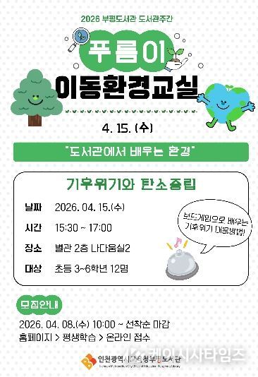프로그램은 기후변화와 친환경을 주제로 보드게임을 활용한 체험형 교육으로 구성했으며, 4월 15일 오후 3시 30분부터 5시까지 부평도서관 별관 2층 나다움실2에서 진행된다.