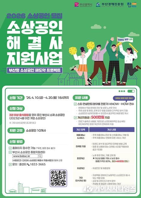 (케이시사타임즈) 부산시(시장 박형준)와 (재)부산경제진흥원은 오늘(10일)부터 오는 4월 20일까지 '소상공인 해결사 지원사업'에 참여할 지역 음식점업 소상공인을 모집한다고 밝혔다.