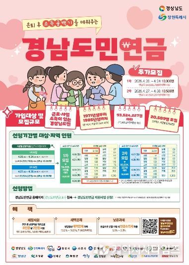 황선복 창원시 인구정책담당관은 “이번 경남도민연금 추가모집은 차수별 인원이 배정되어 있으므로 사전에 모집일정, 본인의 소득구간, 제출서류 등 모집공고를 정확히 확인하시길 바란다”고 요청하며, “시민들의 적극적인 참여를 통해 안정적인 미래를 준비하시길 바란다”고 밝혔다.