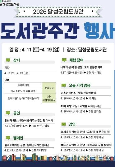 (케이시사타임즈) 대구 달성군립도서관이 ‘2026년 도서관 주간’을 맞아 오는 11일부터 19일까지 주민들을 위한 다채로운 독서 문화 행사를 개최한다.