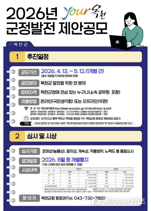 (케이시사타임즈) 옥천군은 창의적인 정책 제안 발굴과 소통하는 열린 행정 실현을 위해 금일부터 내달 13일까지 '2026년 군정발전 제안 공모'를 실시한다.