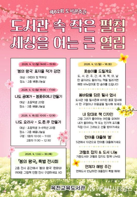 (케이시사타임즈) 옥천교육도서관은 도서관의 날과 도서관 주간을 맞아 4월 12일부터 18일까지 학생과 학부모, 지역주민을 대상으로 다양한 독서문화 행사를 운영한다.