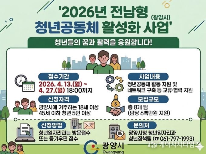 (케이시사타임즈) 광양시는 4월 13일부터 4월 27일까지 ‘2026년 전남형 청년공동체 활성화 사업’에 참여할 청년공동체를 모집한다.