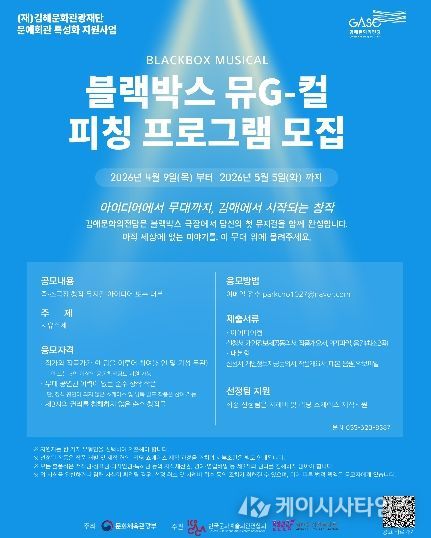 (케이시사타임즈) (재)김해문화관광재단(대표이사 최석철) 김해문화의전당은 2026 문예회관 특성화 지원사업의 일환으로 ‘블랙박스 뮤G컬’ 피칭 프로그램을 운영하고 창작뮤지컬 초연으로 이어지는 30분 리딩 쇼케이스의 작품 공모를 진행한다.