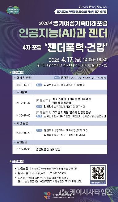 (케이시사타임즈) 경기도여성가족재단은 오는 17일 재단 회의실에서 ‘인공지능과 젠더폭력·건강’을 주제로 4차 경기여성가족미래포럼을 개최한다. 3월부터 5월까지 총 5차례 진행하는 경기여성가족미래포럼 중 이번이 4회차다.