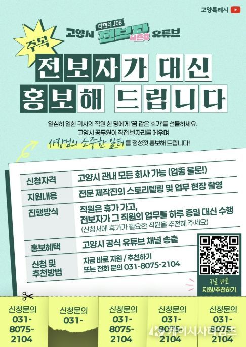 (케이시사타임즈) 고양특례시가 공식 유튜브 채널의 직업 체험 콘텐츠 ‘전보자(타인의 Job)’ 시즌 3를 맞아, 시민 삶의 현장으로 직접 찾아가는 홍보 프로젝트에 참여할 기업과 일터를 모집한다고 14일 밝혔다.