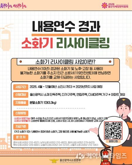 (케이시사타임즈) 울산소방본부는 이달부터 ‘내용연수 경과 소화기 교체(리사이클링)’ 사업을 추진한다고 밝혔다.