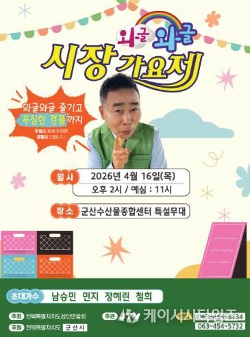 (케이시사타임즈) 군산시가 전통시장에 활력을 불어넣고 시민과 상인이 함께 어우러지는 문화의 장을 마련하고자 ‘와글와글 시장가요제’를 오는 4월 16일 오후 2시, 군산수산물종합센터 신축 건어동 앞 광장에서 개최한다.