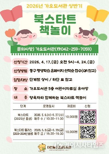 (케이시사타임즈) 대전 동구는 오는 5월 6일부터 29일까지 가오도서관에서 2026 상반기 ‘북스타트 책놀이’ 프로그램을 운영한다고 14일 밝혔다.