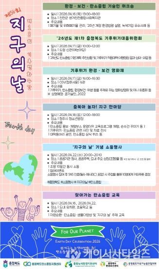 (케이시사타임즈) 충북도가 제56주년 ‘지구의 날(4.22.)’을 맞아 오는 4월 16일부터 22일까지를 ‘기후변화주간’으로 지정하고, 도민과 함께하는 다양한 행사를 추진한다.