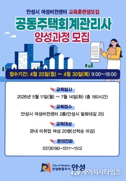 (케이시사타임즈) 안성시 여성비전센터는 경력보유여성의 성공적인 재취업을 지원하기 위해 오는 4월 30일까지 ‘공동주택 회계 관리사 양성과정’에 참여할 직업 훈련생 20명을 모집한다고 밝혔다.