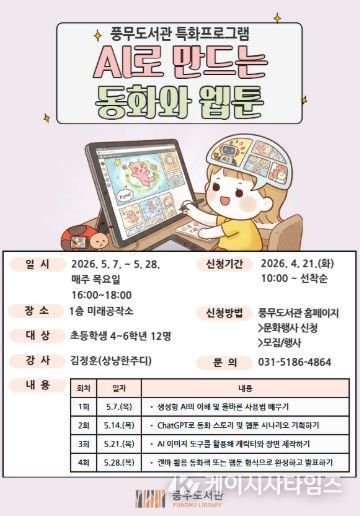 (케이시사타임즈) 김포시 풍무도서관은 가정의 달을 맞아 초등학생 4~6학년을 대상으로 ‘인공지능(AI)으로 만드는 동화와 웹툰’을 오는 5월 7일부터 28일까지 매주 목요일 오후 4시부터 6시까지 총 4회에 걸쳐 운영한다.