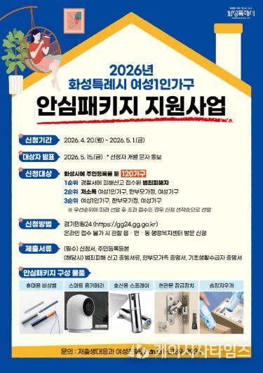 (케이시사타임즈) 화성특례시는 범죄 대응에 취약한 여성 1인가구 등 사회적 약자의 안전한 생활을 지원하기 위해 ‘2026년 여성1인가구 안심패키지 지원사업’을 추진하고 대상자를 모집한다고 밝혔다.