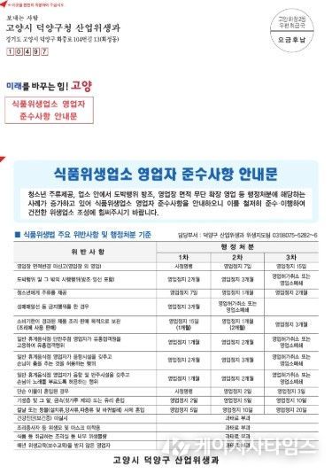덕양구 관계자는 “이번 안내문 배부를 통해 식품위생법 주요 위반사항과 변경된 규정을 적극 안내하고, 영업자의 위생관리 역량을 높이고자 한다”며 “기온 상승으로 식중독 발생 위험이 높아지는 시기인 만큼 예방 수칙 홍보를 병행해 안전한 식품위생 환경 조성에 최선을 다하겠다”고 밝혔다.