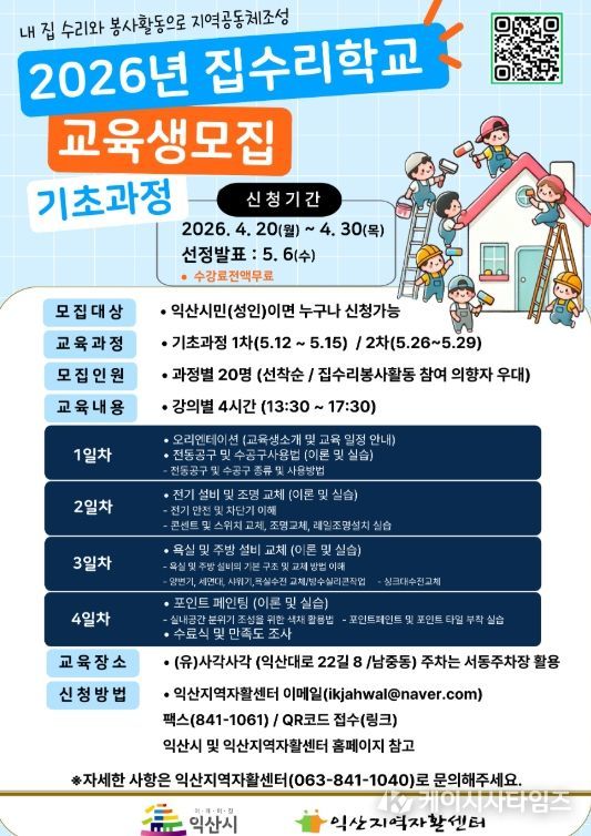 (케이시사타임즈) 익산시는 오는 20일부터 30일까지 집수리학교 기초과정 교육생 40명을 모집한다.