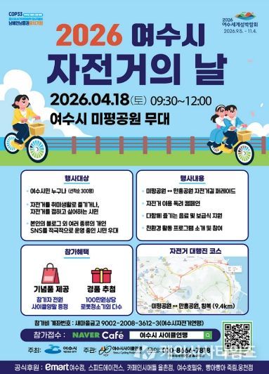 (케이시사타임즈) 여수시는 자전거 이용 활성화와 저탄소 녹색성장에 대한 시민들의 관심을 높이기 위해 오는 18일 토요일 ‘2026년 자전거의 날’ 기념행사를 개최한다.