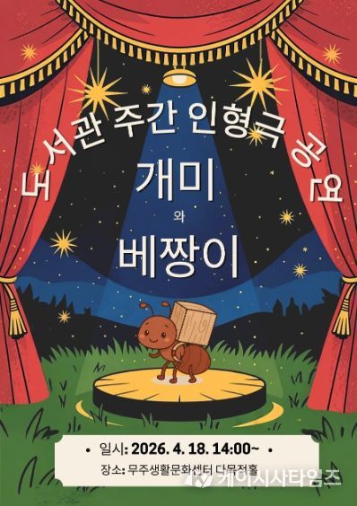 (케이시사타임즈) 무주군이 도서관 주간(4.12.~18.)을 맞아 4월 18일 오후 2시부터 무주생활문화센터 다목적홀(지하 1층)에서 ‘배려와 존중’을 주제로 한 인형극 ‘개미와 베짱이’를 개최한다고 밝혔다.