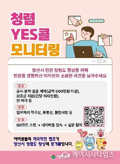 양산시 관계자는 “부패 취약 업무 민원처리 과정에서 겪었던 불편 사항과 문제점을 적극적으로 알려주시길 바란다”며 “청렴 모니터링을 통해 개선 의견을 수렴하고 부조리 요인을 사전에 점검해 비위행위 예방과 민원 만족도 제고를 통해 외부 청렴도 향상에 노력하겠다”고 밝혔다.
