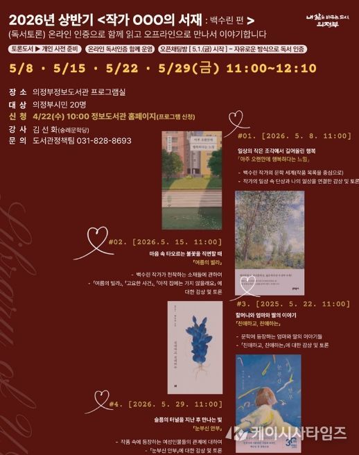 (케이시사타임즈) 의정부시는 2026년 상반기 ‘작가 OOO의 서재: 백수린 편’을 5월 매주 금요일(8일, 15일, 22일, 29일) 총 4회에 걸쳐 의정부정보도서관에서 운영한다.