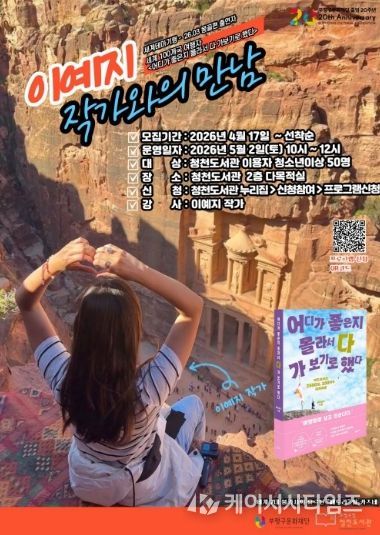 (케이시사타임즈) 부평구 청천도서관은 여행에세이 ‘어디가 좋은지 몰라서 다 가보기로 했다’의 저자 이예지 작가와 함께하는 ‘작가와의 만남’ 프로그램 참가자를 모집한다고 밝혔다.