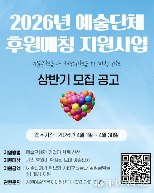 (케이시사타임즈) 강원문화재단은 도내 예술단체의 안정적인 창작기반 마련과 기업의 문화예술 후원 참여 확대를 위해 '2026년 예술단체 후원매칭 지원사업' 상반기 공모를 추진한다.