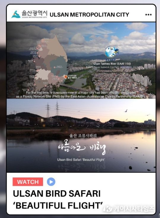 (케이시사타임즈) 울산시는 ‘울산 조류사파리’홍보영상이 국제철새기구 공식관계망(채널)을 통해 전 세계에 소개되며 세계적(글로벌) 생태도시 울산 알리기가 본격 시작됐다고 밝혔다.