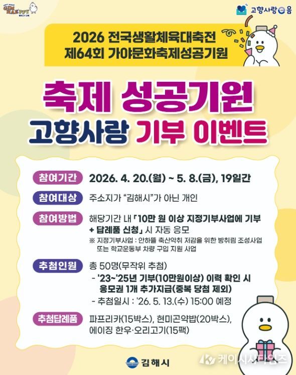(케이시사타임즈) 김해시는 대규모 체육·문화 행사의 성공적 개최를 기원하고 지역의 시급한 현안을 해결하는 지정기부 사업을 널리 알리기 위해 20일부터 5월 8일까지 19일간 ‘고향사랑 기부 혜택 플러스’ 이벤트를 실시한다.