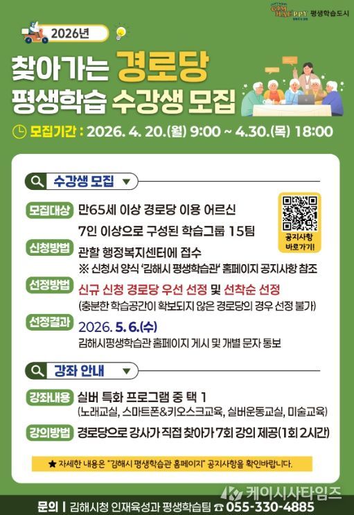 (케이시사타임즈) 김해시는 평생학습 사각지대 해소와 어르신의 활기찬 노후 지원을 위해 오는 5월부터 ‘2026년 찾아가는 경로당 평생학습 프로그램’을 운영한다고 17일 밝혔다.
