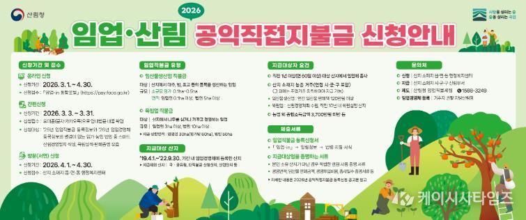 (케이시사타임즈) 전라남도는 임업의 공익기능 증진과 임업인의 안정적 소득 보전을 위해 2026년 임업·산림 공익직접지불금 신청을 30일까지 접수한다고 밝혔다.