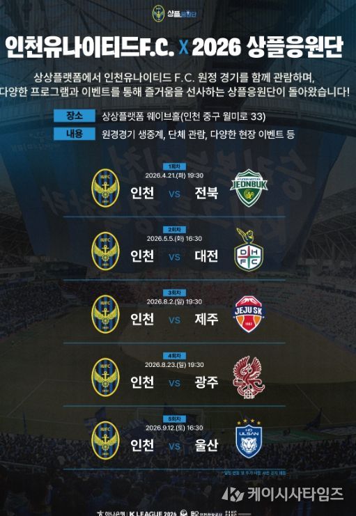 행사는 인천 중구 상상플랫폼 웨이브홀에서 총 5회에 걸쳐 진행된다. 오는 4월 21일 전북현대와의 원정경기를 시작으로 ▲5월 5일 대전 하나시티즌전 ▲8월 2일 제주SK FC전 ▲8월 23일 광주FC전 ▲9월 12일 울산HD FC전 등 주요 원정경기 일정에 맞춰 운영될 예정이다.