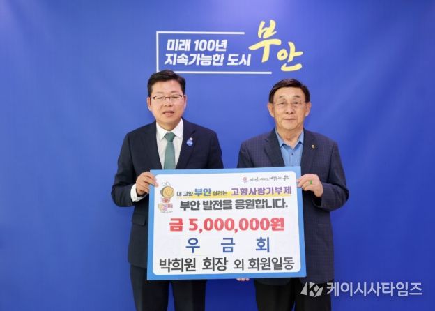 (케이시사타임즈) 부안군은 지난 16일 수도권에서 활발히 활동하며 고향의 명예를 드높이고 있는 기업인 및 전문가 모임인 재경부안군향우회 우금회(회장 박희원)가 고향 부안의 발전을 염원하며 고향사랑기부금 500만 원을 기탁했다고 밝혔다.