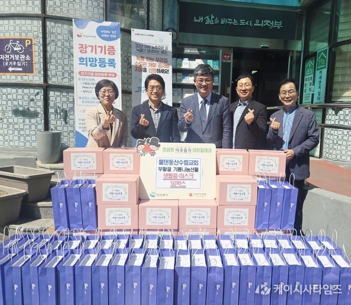 (케이시사타임즈) 의정부시 장암동주민센터는 4월 16일 물댄동산수림교회가 부활절을 맞아 지역 내 어려운 이웃을 위해 ‘기쁨나눔선물 세트’와 마스크 50상자를 기탁했다고 밝혔다.