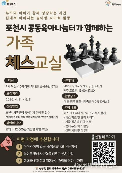 (케이시사타임즈) 포천시 더 큰 행복 포천시가족센터는 공동육아나눔터 상시 프로그램의 일환으로 아동의 논리적 사고력 향상과 부모-자녀 간 긍정적 상호작용을 지원하기 위해 가족 참여형 체스 프로그램 '가족 체스 교실'을 운영한다고 밝혔다.