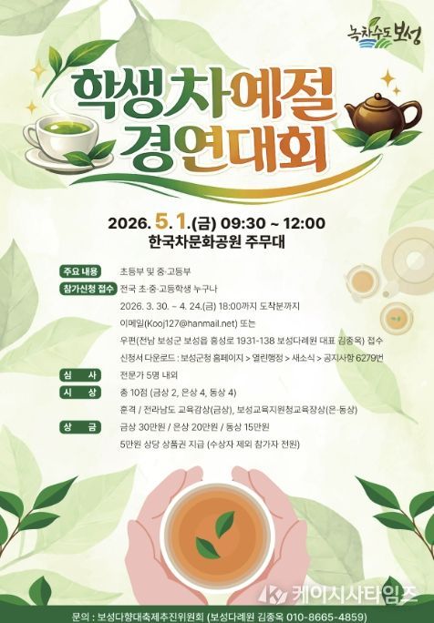 (케이시사타임즈) 보성군은 오는 24일 18시까지 ‘2026 학생차예절경연대회’에 참가할 전국 초·중·고등학생을 모집한다고 밝혔다.